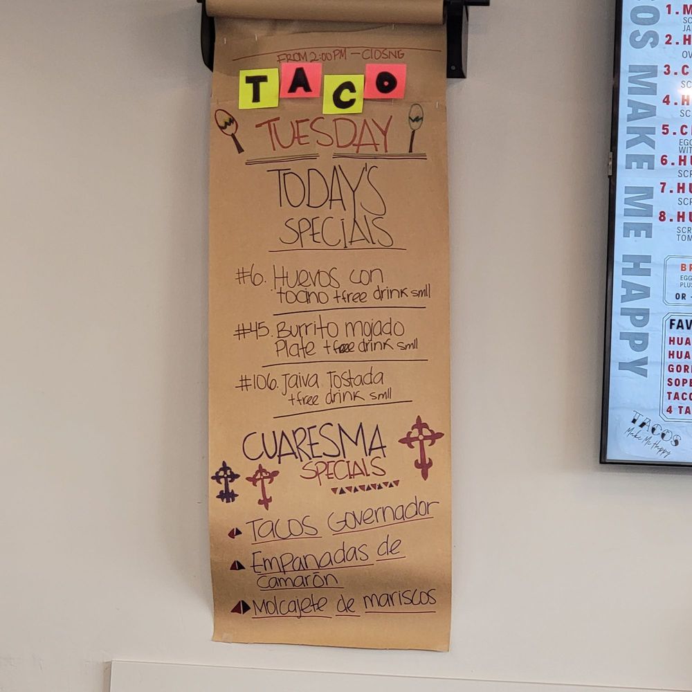 Shredded beef,jalapeo,onions,tomatoeall scramble with eggs.Guacamole,beans,onions,cilantro,lettuce,tomatoe and hot salsa.